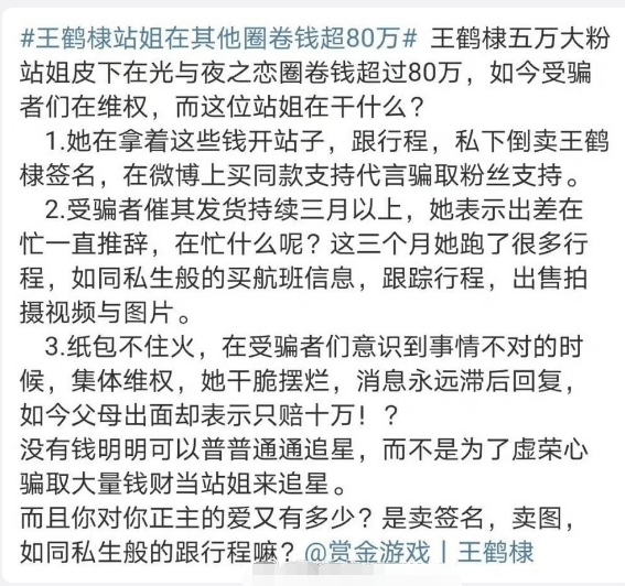 原标题:王鹤棣站姐卷钱超80万后跑路 其父母出面却只赔10万
