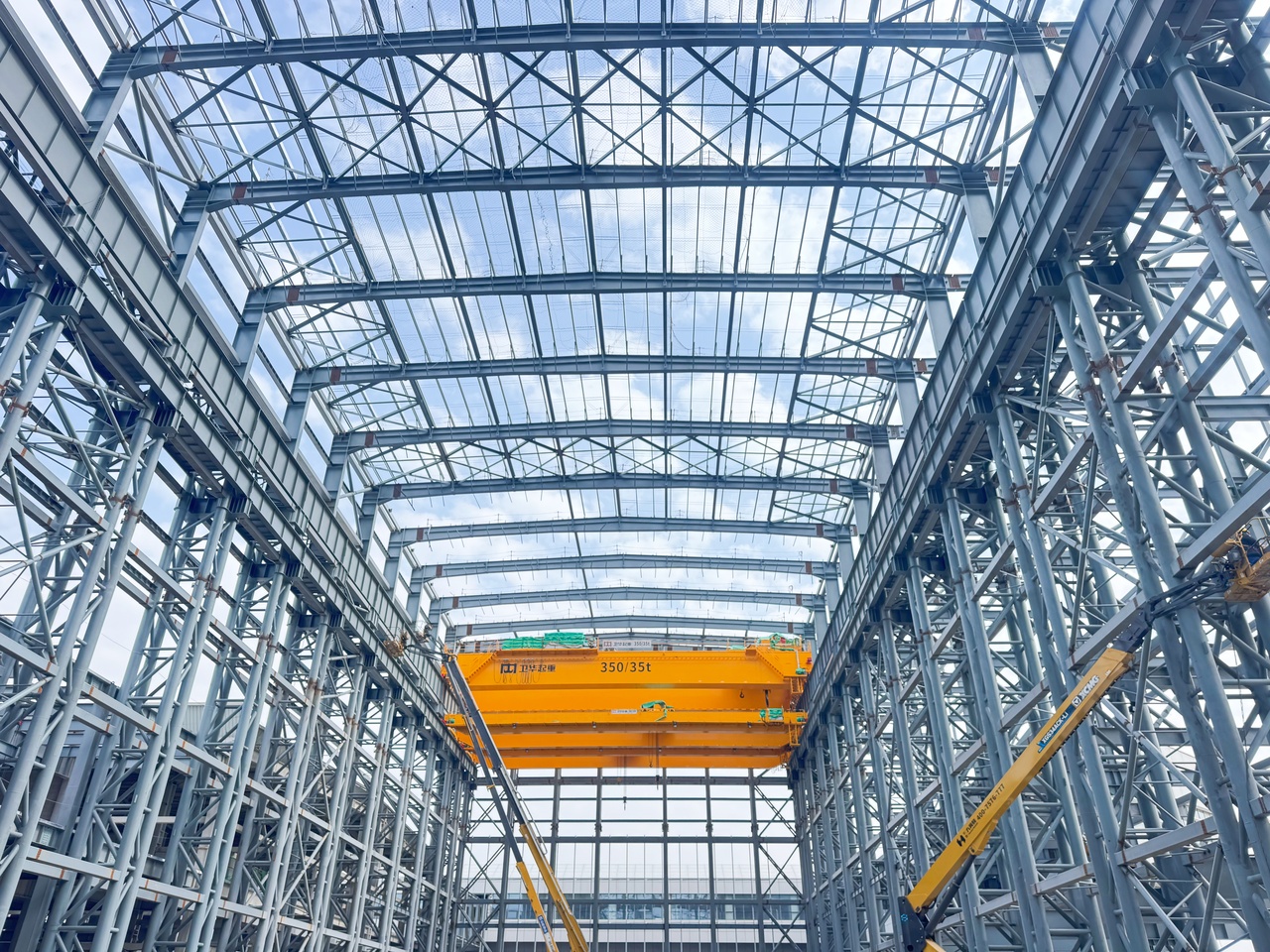 该项目为典型超大超重型单层钢结构厂房,长140米、宽52米、高40米,柱高最高达41.4米,最大构件重达44.3吨,钢梁最大跨度40米,超长超重构件的起吊安装精度要求极高。为此,项目部创新采用“数字化设计+精准吊装+全周期BIM管控”技术体系。“通俗来说,就是先用软件在电脑里搭建所有构件、节点的三维模型,提前模拟吊装、焊接等全过程,乳揉みま痴汉电车中文字幕从源头避免施工误差。”项目总工程师王文琦介绍道。施工中,项目部采用“精准定位+分级吊装+闭环监测”方法,优化构件制作、运输与吊装节奏,严控关键部位焊接质量,确保结构安全稳固、尺寸精准达标。