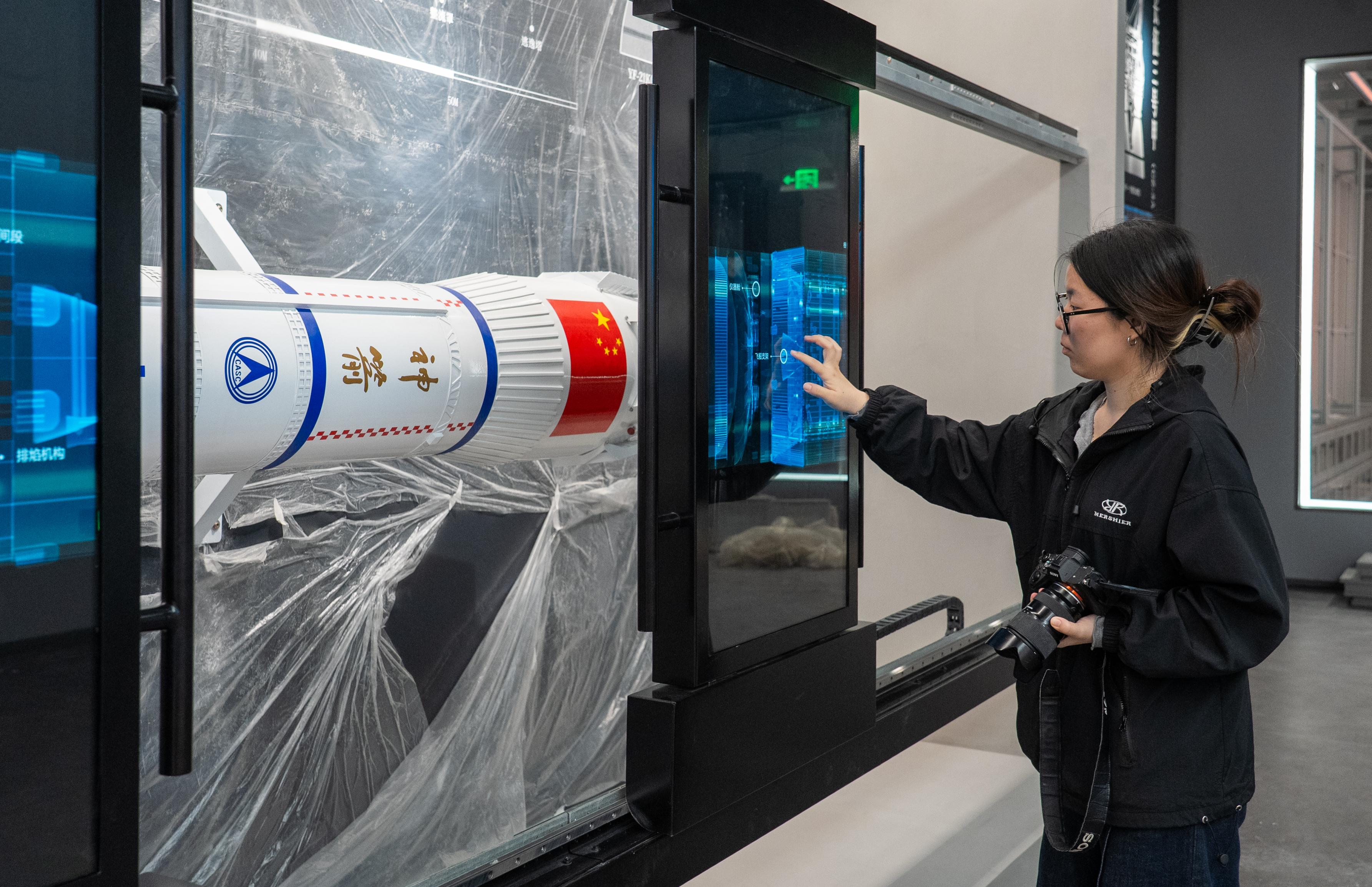 参观者通过触控滑轨屏,手指滑动之处,火箭内部结构便即时呈现 中国(北京)航天科学中心供图